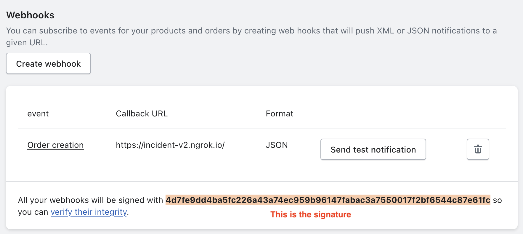 Once the webhook is created, you will the signature at the bottom